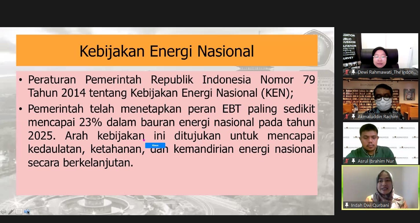 Diskusi Initiative! kali ini akan mengangkat tema “Keterlibatan Daerah dalam Transisi Energi Nasional: Kritik Konseptual dan Gagasan Tata Kelola” bersama Asrul Ibrahim Nur (Research Fellow TII), Akmaluddin Rachim (Manajer Riset Pusat Studi Hukum Energi dan Pertambangan), Dr Indah Dwi Qurbani, S.H, M.H (dosen FH Universitas Brawijaya) serta moderator Dewi Rahmawati Nur A (Peneliti Bidang Sosial TII).