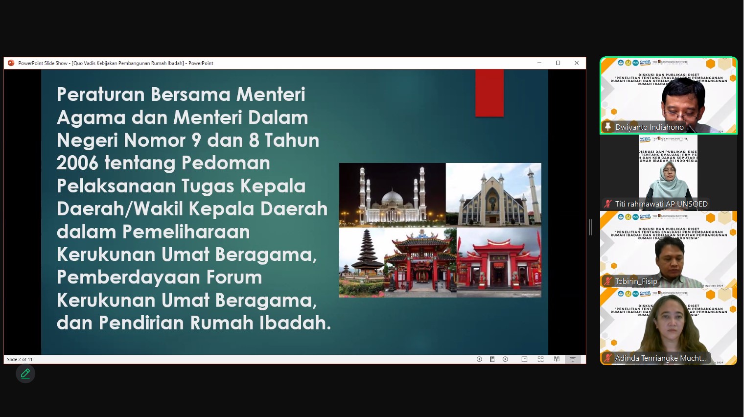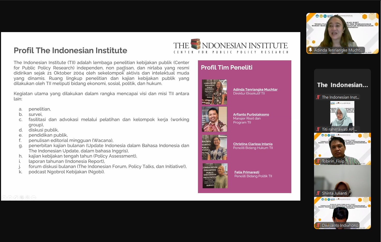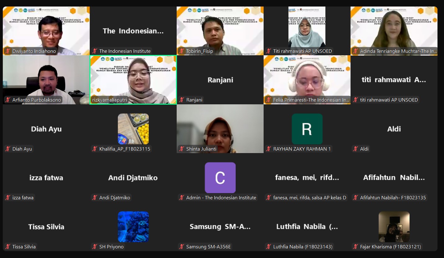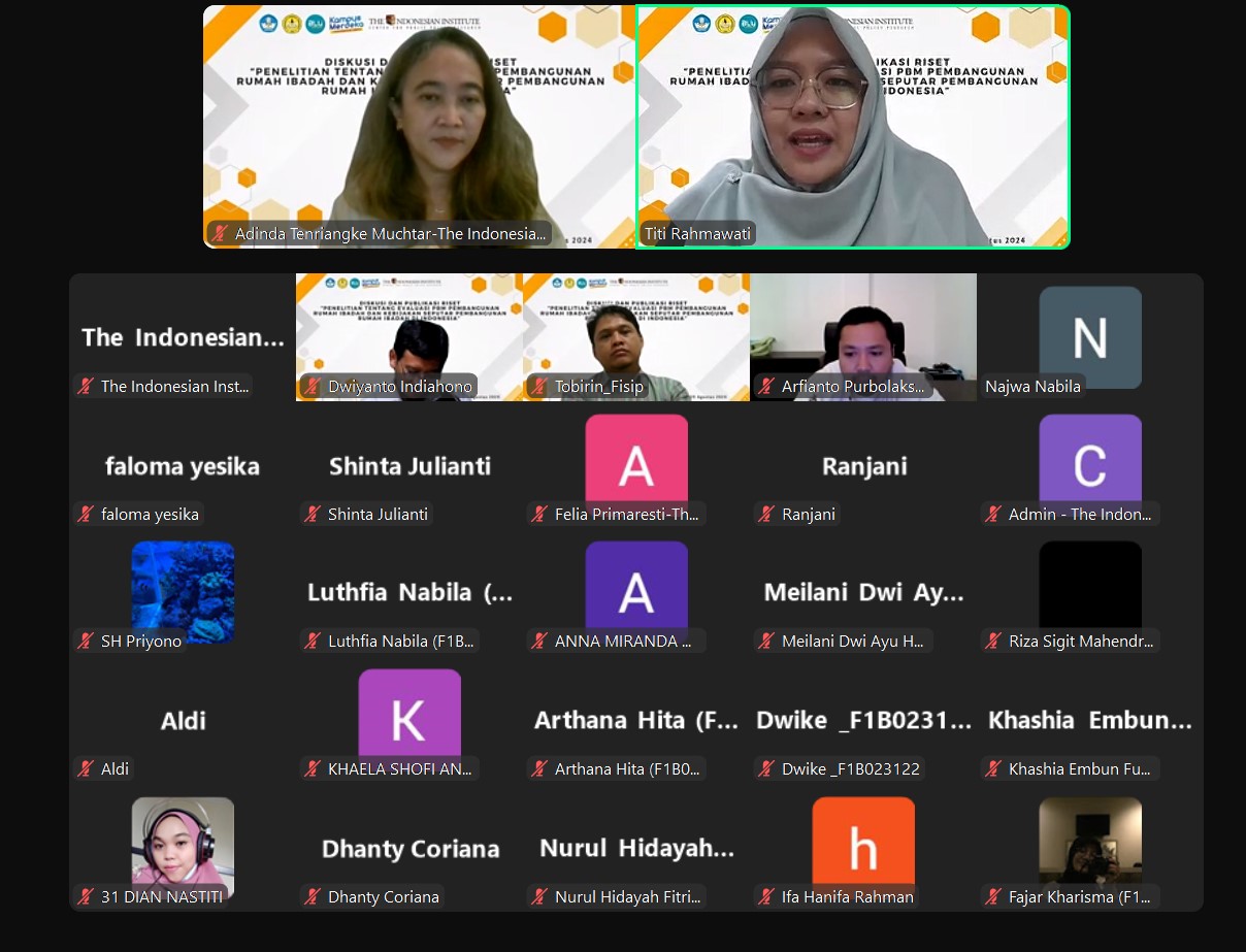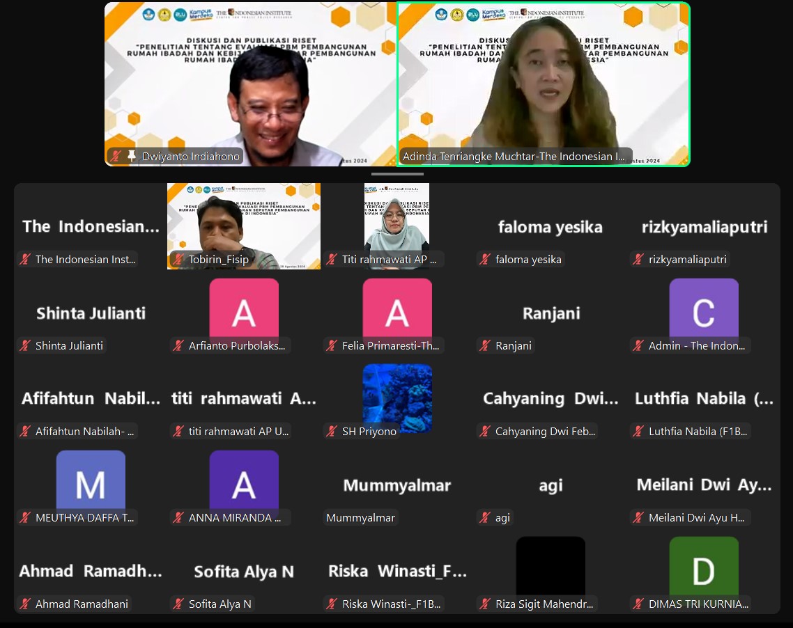 Pada hari Kamis, 29 Agustus 2024, telah diselenggarakan diskusi dan diseminasi hasil riset TII dengan judul “Penelitian tentang Evaluasi PBM Pembangunan Rumah Ibadah dan Kebijakan Seputar Pembangunan Rumah Ibadah di Indonesia”. Diskusi ini merupakan kolaborasi TII dengan Program Studi Ilmu Administrasi Publik, Fakultas Ilmu Sosial dan Ilmu Politik Universitas Jenderal Soedirman. Dalam diskusi ini, digaungkan pentingnya integritas akademisi dalam menanggapi isu kebijakan publik. Selain itu, taat hukum, saling menghargai, dan toleransi sangat diperlukan dalam menghadapi isu keberagaman beragama dan berkeyakinan.
