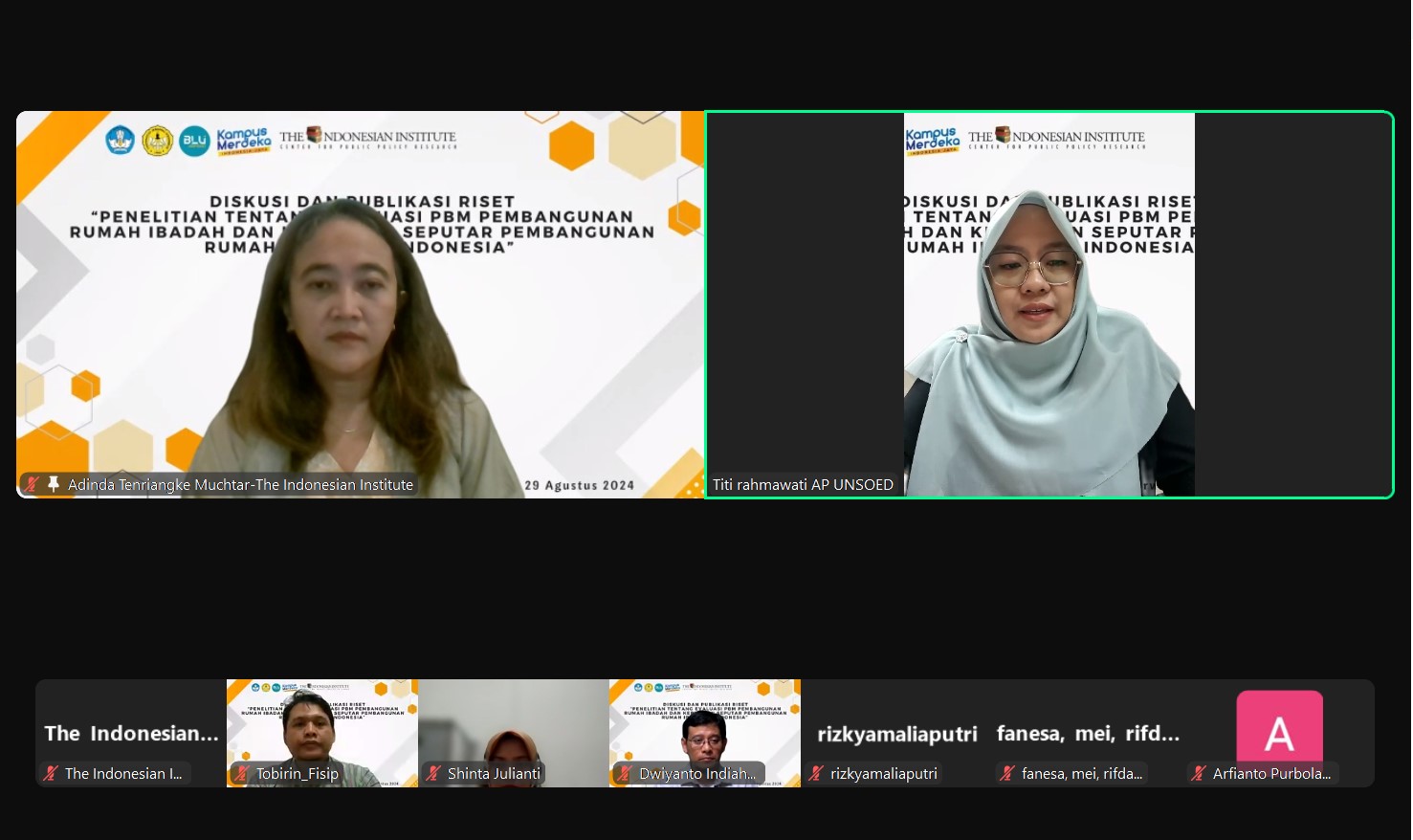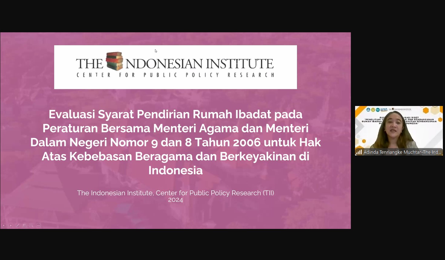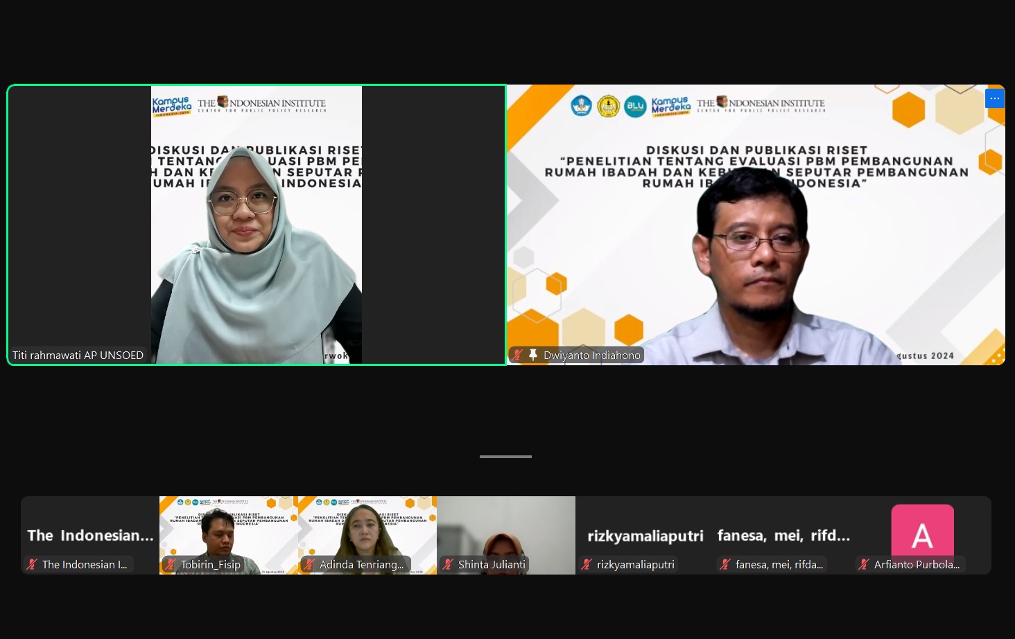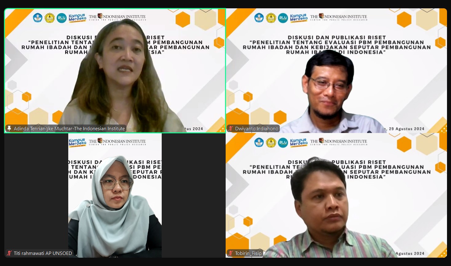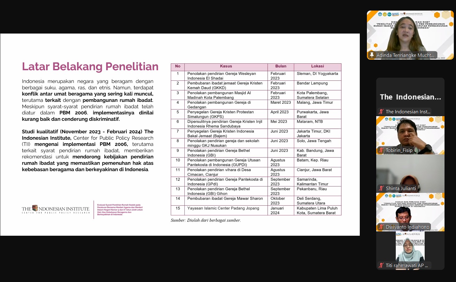 Pada hari Kamis, 29 Agustus 2024, telah diselenggarakan diskusi dan diseminasi hasil riset TII dengan judul “Penelitian tentang Evaluasi PBM Pembangunan Rumah Ibadah dan Kebijakan Seputar Pembangunan Rumah Ibadah di Indonesia”. Diskusi ini merupakan kolaborasi TII dengan Program Studi Ilmu Administrasi Publik, Fakultas Ilmu Sosial dan Ilmu Politik Universitas Jenderal Soedirman. Dalam diskusi ini, digaungkan pentingnya integritas akademisi dalam menanggapi isu kebijakan publik. Selain itu, taat hukum, saling menghargai, dan toleransi sangat diperlukan dalam menghadapi isu keberagaman beragama dan berkeyakinan.