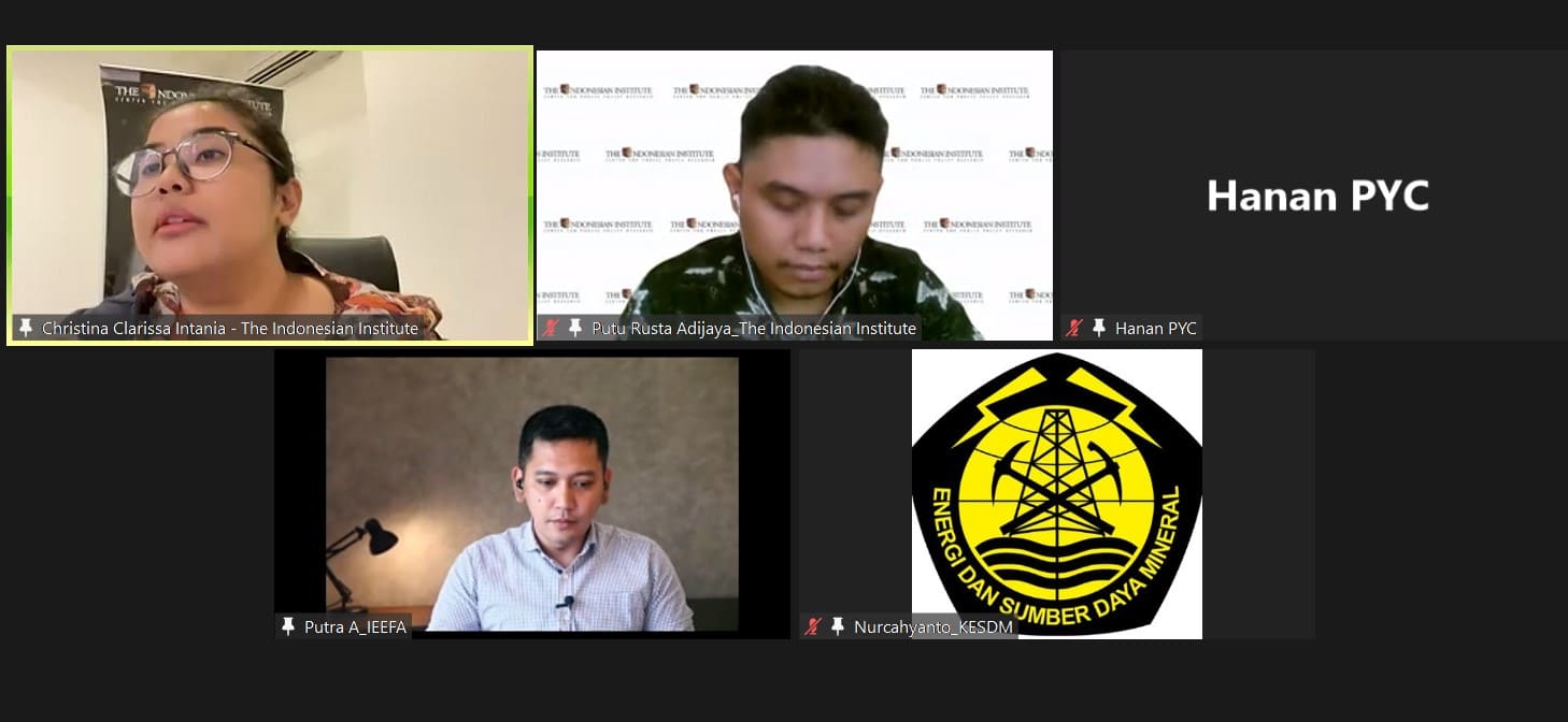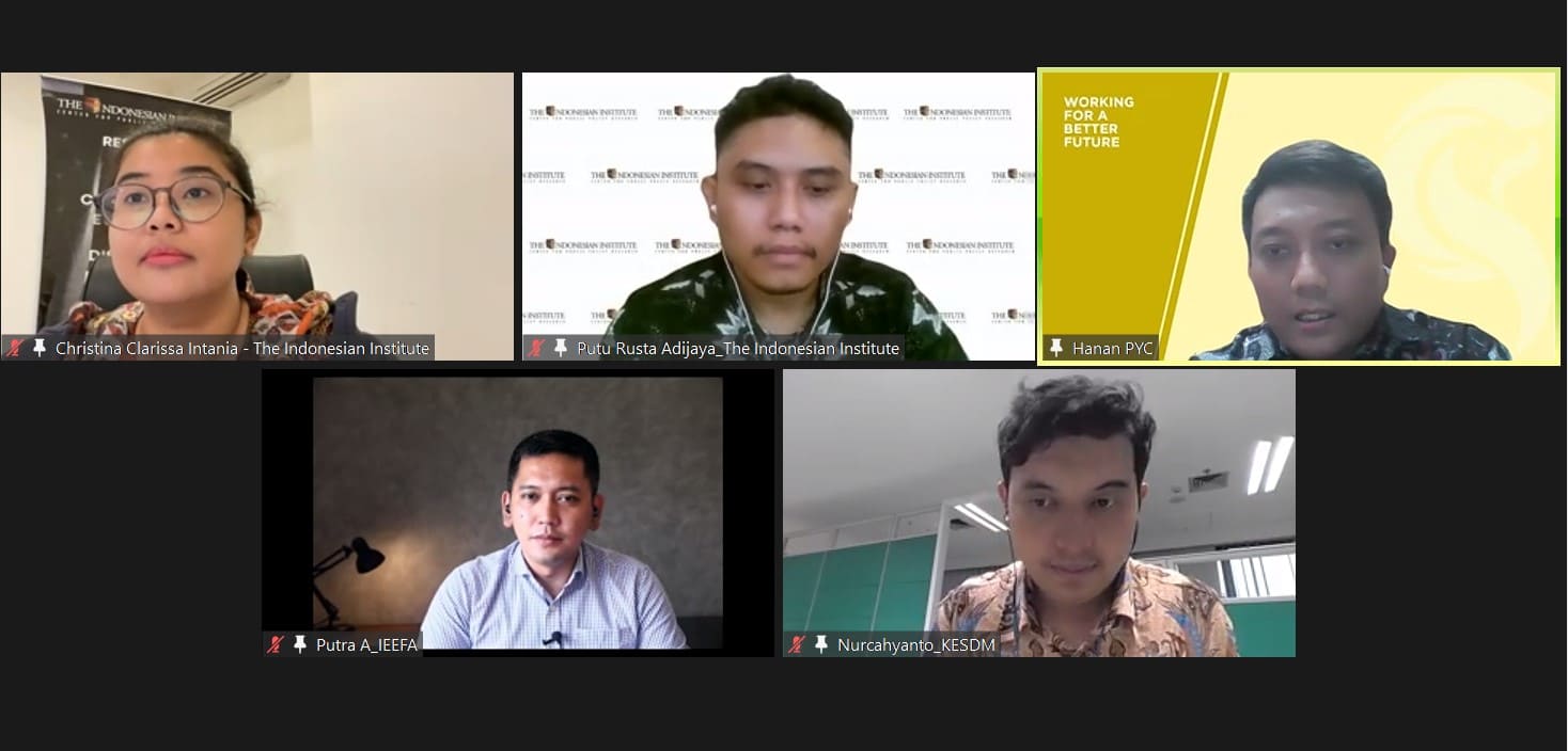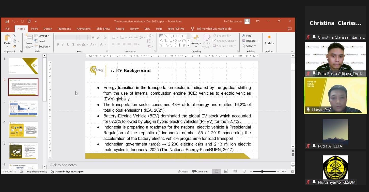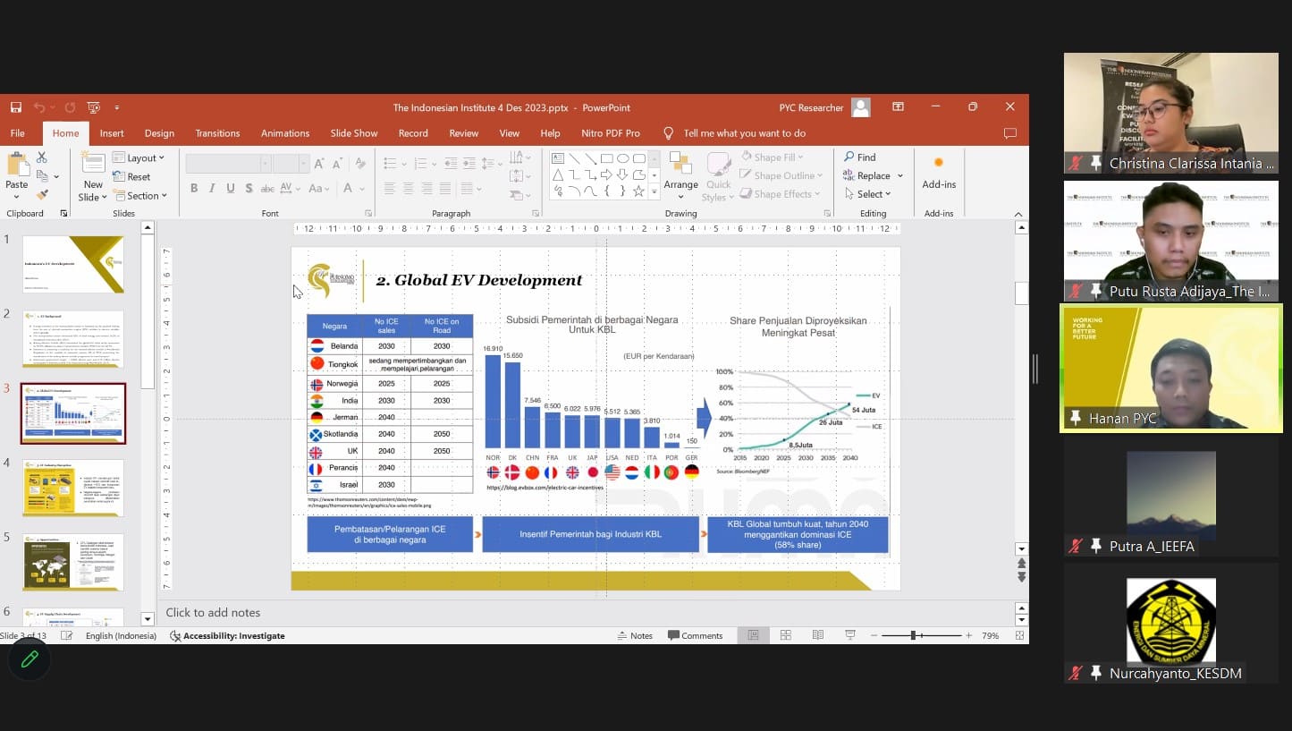 “Policy Talks” kali ini dikemas dengan judul ”Evaluasi Kerangka Kebijakan Kendaraan Listrik di Indonesia Tahun 2023”. Pada kesempatan ini, akan ditampilkan hasil penelitian Putu Rusta Adijaya (Peneliti Ekonomi The Indonesian Institute) dan diperkaya dengan diskusi bersama Gigih Udi Atmo, S.T., M.EPM., Ph.D.* (Direktur Konservasi Energi, Direktorat Jenderal EBTKE Kementerian Energi dan Sumber Daya Mineral), Putra Adhiguna (Asia Technology Lead, Institute for Energy Economics and Financial Analysis), dan Akhmad Hanan (Researcher Purnomo Yusgiantoro Center).