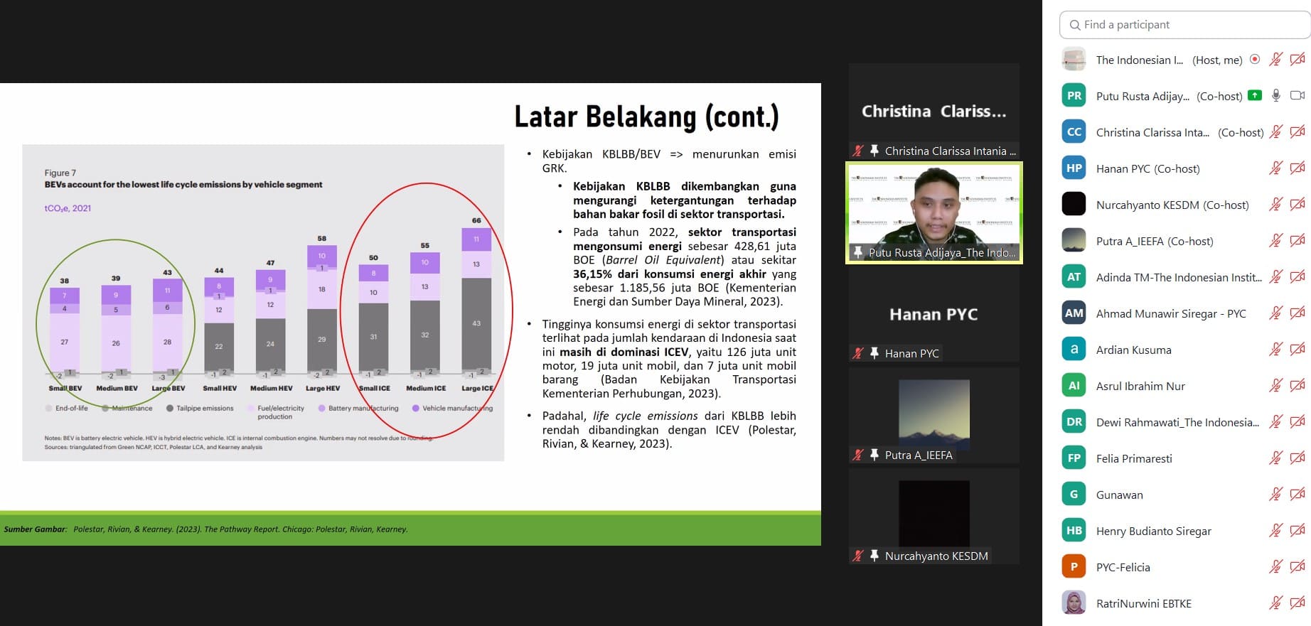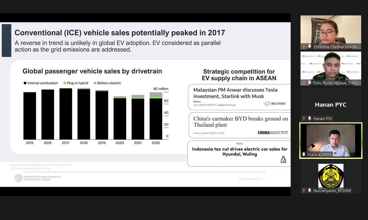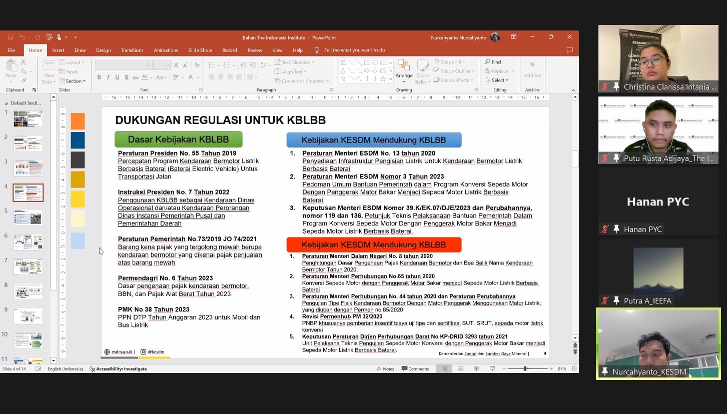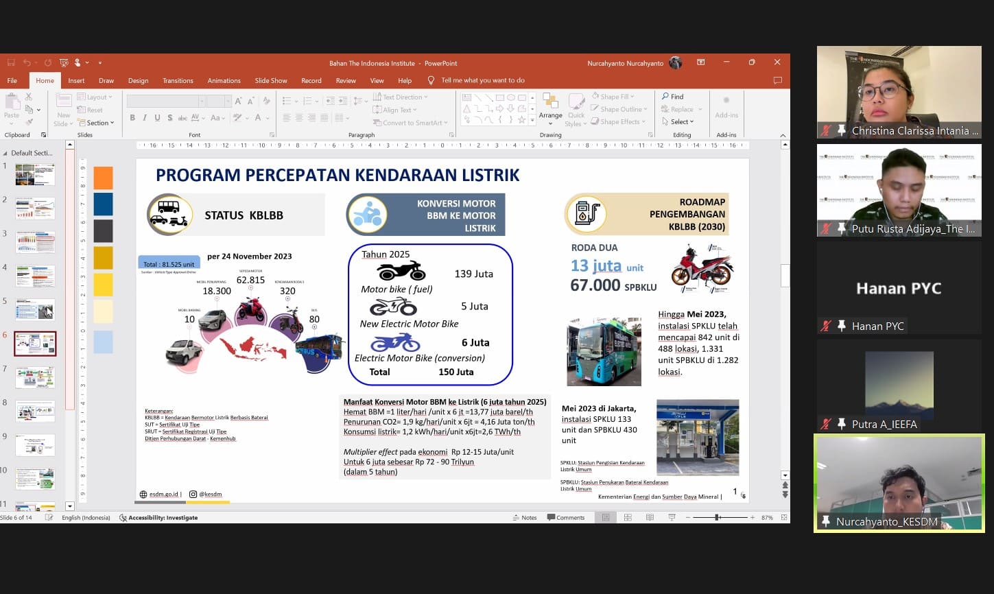 “Policy Talks” kali ini dikemas dengan judul ”Evaluasi Kerangka Kebijakan Kendaraan Listrik di Indonesia Tahun 2023”. Pada kesempatan ini, akan ditampilkan hasil penelitian Putu Rusta Adijaya (Peneliti Ekonomi The Indonesian Institute) dan diperkaya dengan diskusi bersama Gigih Udi Atmo, S.T., M.EPM., Ph.D.* (Direktur Konservasi Energi, Direktorat Jenderal EBTKE Kementerian Energi dan Sumber Daya Mineral), Putra Adhiguna (Asia Technology Lead, Institute for Energy Economics and Financial Analysis), dan Akhmad Hanan (Researcher Purnomo Yusgiantoro Center).