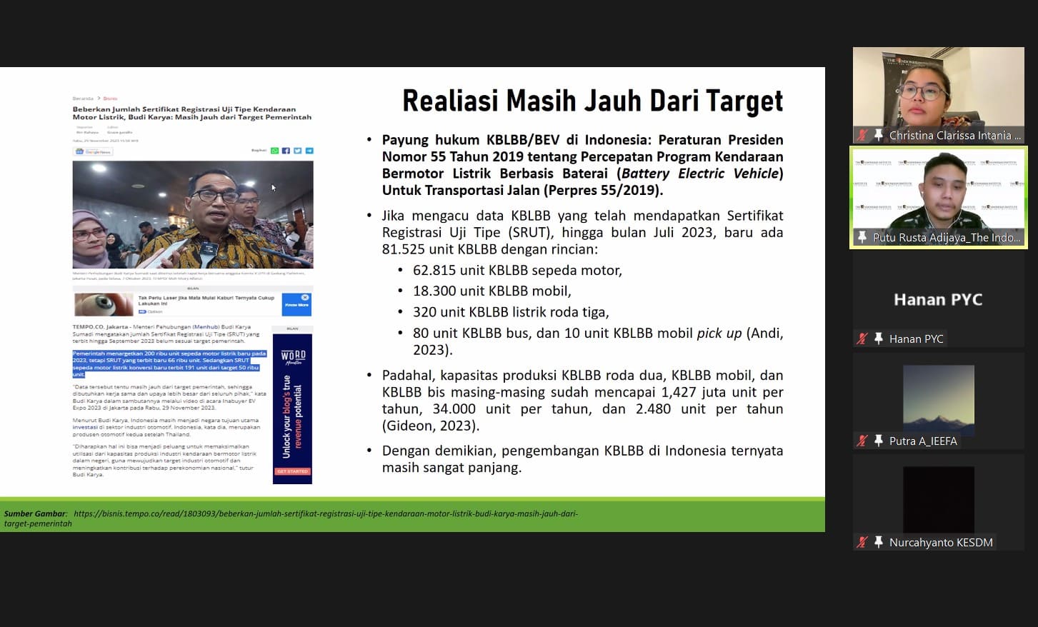 Perubahan iklim yang terakselerasi saat ini telah berpengaruh terlalu dalam baik bagi kondisi sosial, ekonomi, dan lingkungan. Indonesia pun telah mengeluarkan Peraturan Presiden Nomor 55 Tahun 2019 tentang Percepatan Program Kendaraan Bermotor Listrik Berbasis Baterai (Battery Electric Vehicle) Untuk Transportasi Jalan (Perpres 55/2019) sebagai payung hukum dalam mengakselerasi EV di Tanah Air. Namun, pengembangan KBLBB di Indonesia ternyata masih sangat panjang yang terlihat dari realisasi kendaraan listrik di Indonesia yang masih jauh dari target.